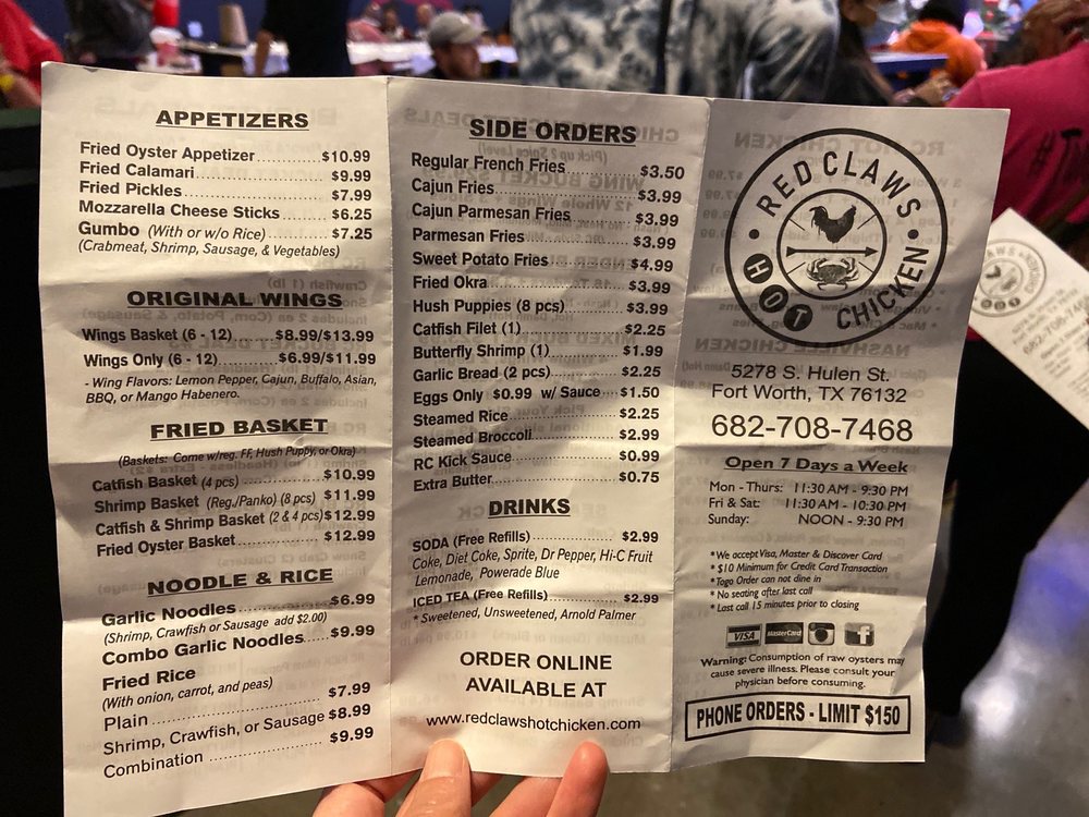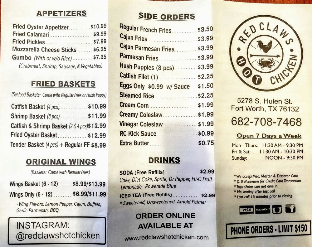Red Claws Crab Shack, located in Fort Worth, TX, offers a diverse menu of chicken wings, Cajun/Creole dishes, and seafood. Customers praise the flavorful dishes and quick service. The Red Claws Hot Chicken and Nashville Hot Chicken are popular choices, with options like whole wings and tenders served with flavorful sides. The restaurant also caters to holidays, providing a convenient dining option with great food and service. In addition to the tasty food, customers appreciate the cozy ambiance and variety of menu choices. Whether you're craving a spicy chicken sandwich or some fresh seafood, Red Claws Crab Shack has something for everyone. Make sure to try their signature sauce for a truly memorable dining experience.